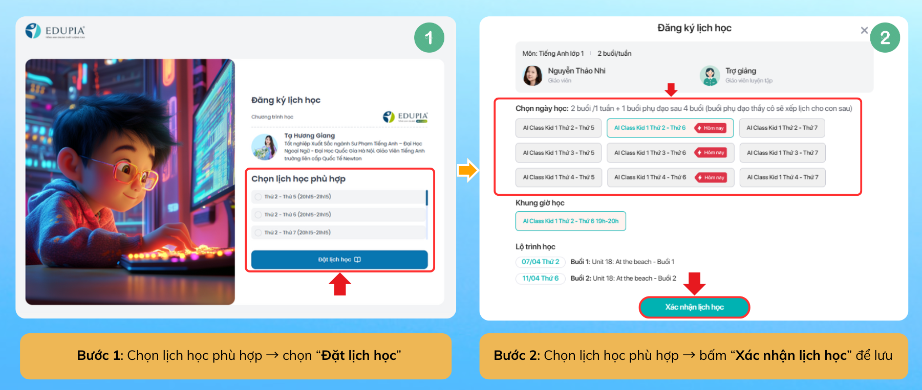 Bước 1: Tại giao diện "Đăng ký lịch học", chọn lịch học phù hợp sau đó bấm "Đặt lịch học".